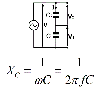 В цепях переменного тока, в высоковольтных схемах, применяют делители напряжения на конденсаторах. Здесь используется реактивный характер сопротивления конденсаторов в цепях переменного тока. Величина реактивного сопротивления конденсатора в цепи переменного тока зависит от электроемкости конденсатора и от частоты напряжения. Вот формула для нахождения этого сопротивления: