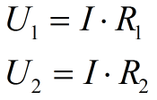 Теперь если подставить выражение для тока в формулы для падений напряжений на резисторах, то получим формулы для нахождения величин напряжений на каждом из резисторов делителя: