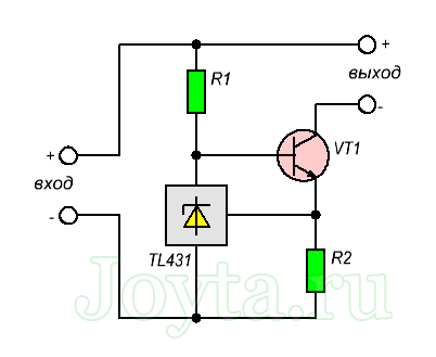 Нужное напряжение регулируемого стабилитрона подбирается при помощи резистора R1. Для настройки регулируемого стабилитрона временно вместо резистора R1 подключают переменный резистор, номиналом 10 кОм. После установки нужного напряжения, измеряют полученное сопротивление переменного резистора и устанавливают постоянный резистор близкого номинала.