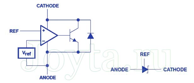 Принцип работы схемы регулируемого стабилитрона заключается в том, что изменяя смещение в базе транзистора относительно эмиттера, меняется его внутреннее сопротивление, а следовательно подение напряжения на переходе эмиттер-коллектор транзистора. Напряжение стабилитрона и перехода эмиттер-коллектор транзистора складываются.
