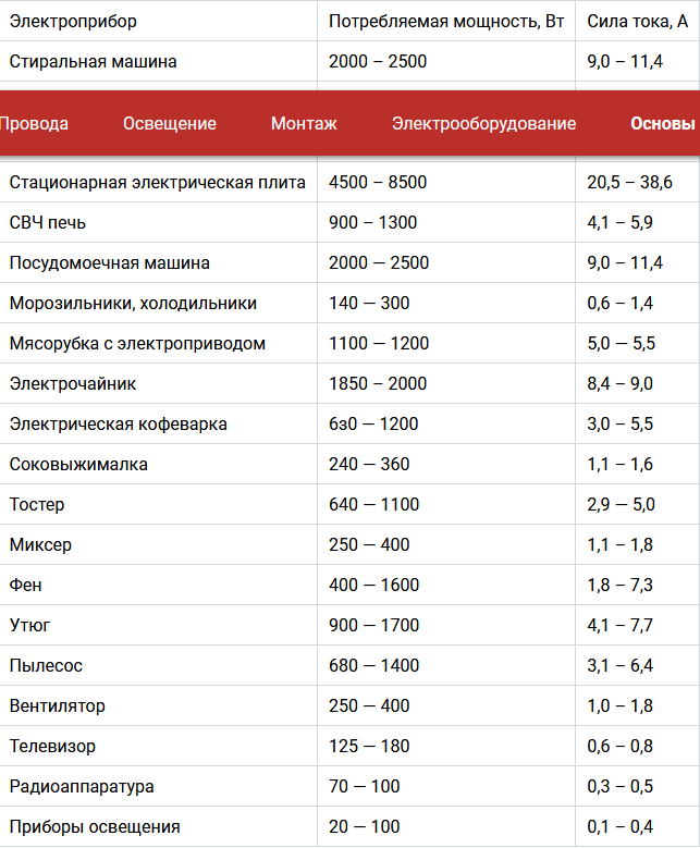 Ниже в таблице представлены величины нагрузки типичных бытовых электроприборов и потребляемый ими ток (для напряжения 220 В).