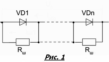 Если все шунтирующие сопротивления выбрать одинаковыми по номиналу, то и обратные напряжения на всех диодах будут одинаковыми и не зависящими от разных обратных сопротивлений диодов.