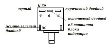 Эта схема контактов термореле типа К-59, которая позволяет составить представление о том, какие именно провода куда должны быть подключены. Цветовая маркировка может отличаться, сохранить информацию помогут фото на телефоне, подобную схему также можно нарисовать самостоятельно