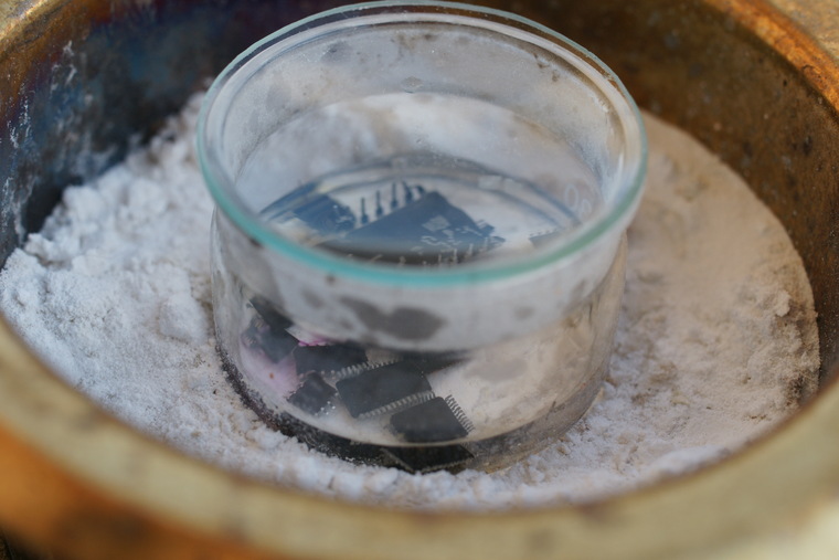 Берем интересующие нас микросхемы, добавляем концентрированной серной кислоты. Довести до кипения (~300 градусов), не помешивать