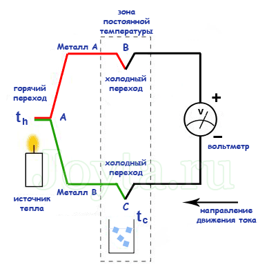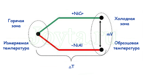 При подключении термопары к измерительному прибору получается еще один термоэлектрический переход. Таким образом, фактически получается два перехода находящихся в разных температурных режимах, поэтому входной сигнал на измерителе будет пропорционален разности температур между этими двумя переходами.