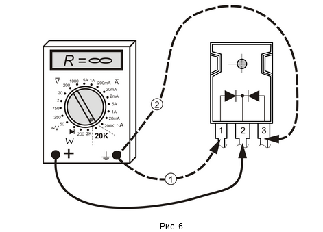 Проверка и точная диагностика диодов Шоттки, на практике, является достаточно непростым делом, т. к. многое здесь определяется типом используемого измерительного прибора и опытом подобных измерений, хотя определить обычный пробой одного или двух диодов диодной сборки Шоттки не составляет особого труда. Для этого необходимо выпаять диодную сборку и проверить тестером оба диода согласно схеме на рис. 5. При подобной диагностике тестер необходимо установить в режим проверки диодов. Неисправный диод в обоих направлениях покажет одинаковое сопротивление (как правило, очень малое, т. е. покажет короткое замыкание), что и указывает на его непригодность для дальнейшего использования. Однако явные пробои диодных сборок в практике встречаются очень и очень редко.